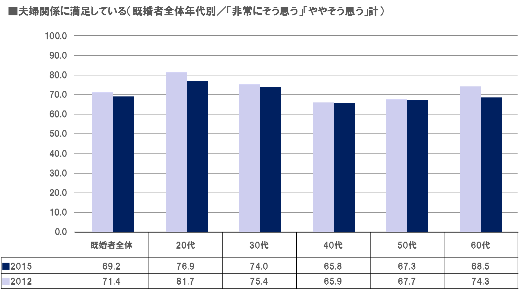 ・20代~60代既婚者において、夫婦関係に満足している割合は69.2%で2012年(71.4%)より2.2ポイント減少。