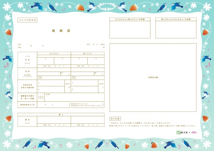 「いちご」で有名な栃木県は、可愛さにアンティークな雰囲気を漂わせたデザインの婚姻届に!よくみると、美しいさえずりで有名な栃木の鳥、オオルリが歌を歌っています。