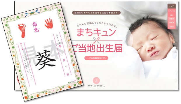 2014年7月にご当地婚姻届のダウンロードサービスを開始し、多くのカップルにご好評いただいている「まちキュン・ご当地婚姻届」。この第二弾として、「まちキュン・ご当地出生届」が2015年3月23日(月)よりスタートいたします。第一弾では、地域(自治体)から結婚するカップルへの祝福を・・・と取り組んでまいりましたが、今回は「うまれてくる子どもに地域(自治体)からの祝福」を・・・というコンセプト。