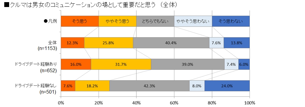 「クルマは男女のコミュニケーションの場として重要だと思う」人は、全体の約4割。 ドライブデート経験者では約半数が重要だと回答。