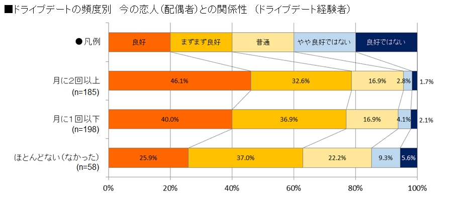 ドライブデートをしたカップルの約4分の3がパートナーとの関係性は良好と回答。 ドライブデートの頻度にも相関あり。ドライブデートでカップルの関係性も大幅に好転!?