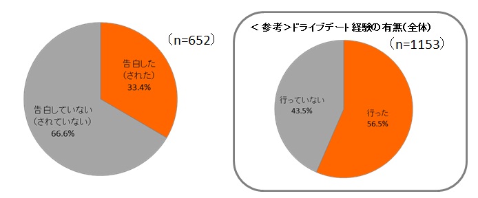 ドライブデート経験者にクルマの中で告白した経験・告白された経験をきいてみると、「告白した(された)」人は33.4%と実に3分の1が経験があると答えています。恋愛における象徴的なシチュエーションにおいて、クルマの中という空間が活用されており、実際にカップルの関係性構築において重要な場となっているようです。