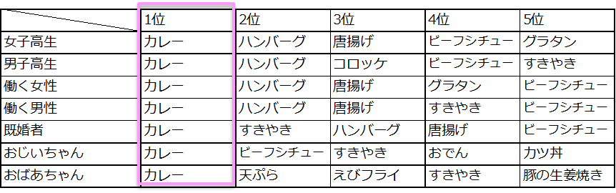 『ゼクシィ』の調査によると、「日常の中のどんなことが幸せ度を高くするか」という質問に対し、お風呂や睡眠、好きな人・パートナーの存在などを押さえて最も支持を集めたのは、「我が家で家庭料理を食べる」でした。では「幸せになれる家庭料理は何か?」と聞いたところ、高校生からおじいちゃんおばあちゃんまで全世代共通で「カレー」が1位に!さらに、「カレーをあまり食べない」人の“幸せ度”が51.5%だったのに対し、「カレーをよく食べる」人の“幸せ度”は75.0%にのぼることもわかりました。すごいぞカレー!