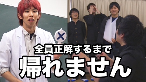 とある教室に何も知らずに集められたYouTuber16名。はじめしゃちょーが現れ、抜き打ちテストの実施を伝えます。今回YouTuberたちが挑戦したのは中学生レベルの問題20問。気になる答え合わせの場面では、「江戸幕府を開いたのは織田長信」「世界貿易機関の略称はGPS」など、思わず茫然とするような珍回答も多数出現。