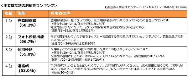 2016年3月15日リリースからわずか3か月で全国130を超える保育園・幼稚園・学童保育施設などで導入が決定しております。子どもの日常を子育てに関わる全ての方々で共有することで、子どもを中心とした関係にこれまで以上の強い信頼感や共感が生まれ、子育てをいっそう豊かにすることを目指してまいります。