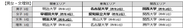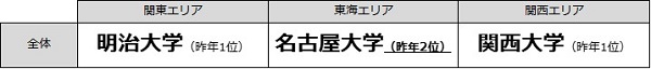・関東エリアでは8年連続「明治大学」、関西エリアでは9年連続「関西大学」、