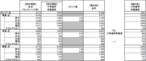 関東エリア、東海エリア、関西エリアそれぞれにおいて平成27年度「学校基本調査」(文部科学省)の2年生(本調査の母集団;2017年3月卒業予定の高校3年生)から男女構成比を算出し、エリア毎の男女構成比を補正している。分析対象は大学進学希望者のみを抽出している