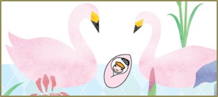 苫小牧市の市の鳥は「白鳥」。2羽の白鳥が寄り添う間にはおくるみ包まれた赤ちゃんのとまチョップ。市の花「ハスカップ」と「ハナショウブ」が彩るそのデザインは自然に恵まれた苫小牧らしいデザインです。