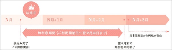 ②ご利用日から最大3ヶ月間は無利息となっております。「ゼクシィ結婚式費用立替えプラン」をご利用頂いた場合、ご返済期日*までに、ご祝儀やお祝い金等でご返済を頂ければ利息は発生いたしませんので、結婚式関連費用のお支払いのための「立替え」としてもご利用いただけます。