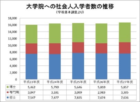 大学院進学を希望する者にとって費用は一番の障壁になっており、大学院への社会人入学者数は、毎年16,000人強で伸び悩んでおります(グラフ右)。諸外国と比べてもこの数字は低く、大学入学者のうち25歳以上の各国平均が約20%に達し、社会人学生も相当数含まれる一方、日本人の社会人学生比率は、1.9%と低い状況です。(出典:大学高等教育機関「 OECD Stat Extracts (2012)」)こうした中、日本の社会人学生をもっと増やしていこうと教育再生実行会議においても大学・大学院の学び直し機能の強化が提言されています。大学・大学院では今、国によって社会人の学び意欲にこたえる教育プログラムの拡充や学びやすい環境の整備、資金的な支援の増強が進んでいます。そこで本誌では、そんな「知られざる」制度を使い大学・大学院を活用する最新ノウハウを、実際に学ぶ社会人学生の皆さんの多くの実例を通して紹介します。