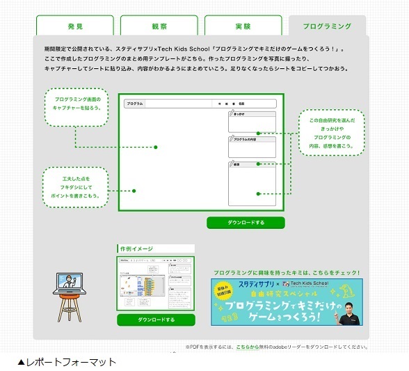 2020年から小学校で必修化となる予定のプログラミング教育は、論理的思考力を養うことが目的とされています。プログラミングを題材としたこの「自由研究スペシャル プログラミングでキミだけのゲームをつくろう!」は、子どもが楽しみながらゲームがつくることが可能。無料お試し登録後にダウンロード可能なレポートフォーマットも合わせてご利用いただくことで、制作からレポートまでを子ども1人で完成させることができます。約半数(46.7%)のご家庭が8月上旬から、自由研究に着手すると回答するなか、子どもの自立心や、成功体験も養う一助ともなることを願っております。