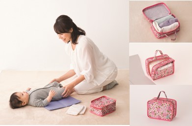 今号の付録はザ・フラワースタンド_ケイタマルヤマの消臭機能つきマルチポーチ。オムツやお着替えなど荷物の多いママのことを考えマチつきでたっぷり入る大きめサイズに作りました。