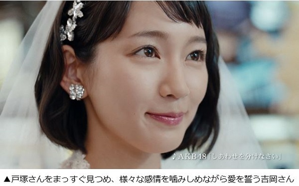 今回のCMは、ふたりで結婚準備を進めてきて、そして迎えた人生最良の日を描いた作品になっています。挙式が行われているチャペルで、親族や親友、知人など、ふたりを祝福するために駆けつけたゲストに見守られる中、誓いを前に向き合い立つ吉岡さんと戸塚さん。司式者からの問い掛けにまず戸塚さんが「誓います」と、堂々とはっきりとした声で、ふたりの将来に対する覚悟さえ感じとれるように応じます。次に、司式者の問い掛けは吉岡さんに。吉岡さんは、問い掛けの言葉に耳を傾けながら、この日を迎えられた喜び、自分を支えてくれた全ての人への感謝、挙式を迎えた少しの緊張とそれを上回るワクワク感など、様々な想いがこみ上げてきて、目にはうっすらと涙が浮かびます。そんな中、永久の愛を問われた吉岡さんは、「はい」と返事し、ひと呼吸おいた上で微笑みながら「誓います」と続けました。様々な想いが濃縮された、一瞬一瞬に込められたそれぞれの感情と表情に注目しながらご覧いただければと思います。