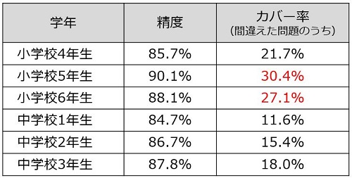 今回解析対象としたのは、『スタディサプリ小学講座・中学講座』における小学4年生から中学3年生までの算数・数学で、精度80%を最低ラインとし解析を実施。小学5年生で解けない問題全体の30.4%の問題を90%の精度で予測、そのほか小学6年生が27.1%の問題を88%の予測しました。