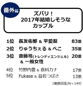 調査方法/2016年1月1日~11月14日までに結婚を発表した芸能人を対象とし、花嫁1000人委員会メンバー149名に対しインターネット調査を実施。