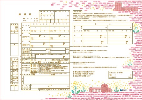 明治時代に建設された赤レンガ造りの街並みが有名な洲本市。そのレトロな雰囲気をイメージした婚姻届です。婚姻届と記念用を左右に並べるとレンガが繋がって見える遊び心や、菜の花の黄色も可愛い色合いのポイントのデザインです。