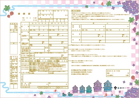 国内最古とされる組み立て式農村歌舞伎舞台「西塩子の回り舞台」。国内外から評価を受けるその構造の美しさを背景のデザインで表現しています。モチーフには久慈川・那珂川の清流と鮎、市を代表するバラやカワセミがあしらわれ、豊かな自然が詰まった婚姻届です。