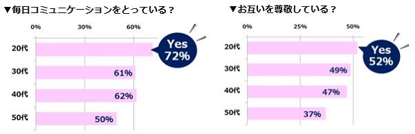 そんな20代の夫婦のお互いへの意識を30代以降と比較すると、「毎日コミュニケーションをとるようにしている」「お互いを尊敬する」といった、互いを個として尊重しつつ、すれ違いにならないような気づかいが見てとれます。