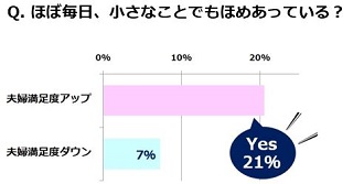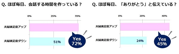 さらに、結婚している人でも今後夫婦満足度をアップさせるために有効なコミュニケーションを探るべく、「今」が「結婚直後」よりも「パートナーに対する満足度」がアップしている夫婦とダウンしている夫婦にわけて傾向を探りました。すると満足度がアップした夫婦は満足度がダウンした夫婦よりも「会話する時間を作る」「『ありがとう』と伝える」「小さなことでもほめあう」といった会話に関するコミュニケーションを「ほぼ毎日」行っている割合が高いことが判明。共働きで忙しい「ペンギン夫婦」の生存戦略としても、会話に関するコミュニケーションは重要な役割を持つといえそうです。