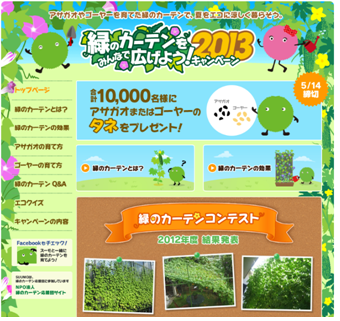 キャンペーンサイトには、緑のカーテンの作り方や、エコにまつわるクイズに答えるともらえる壁紙やスクリーンセイバーなどオリジナルデジタルツールもご用意いたします。4月末からは各地で育っている緑のカーテンの写真投稿コーナーを開設予定。さらに、7月から9月には、緑のカーテンの「完成写真」、『緑のある暮らし』をテーマとした「絵日記」「川柳」のコンテストを実施予定です。