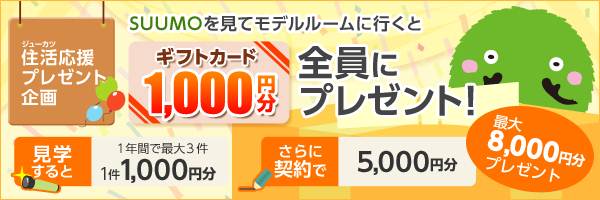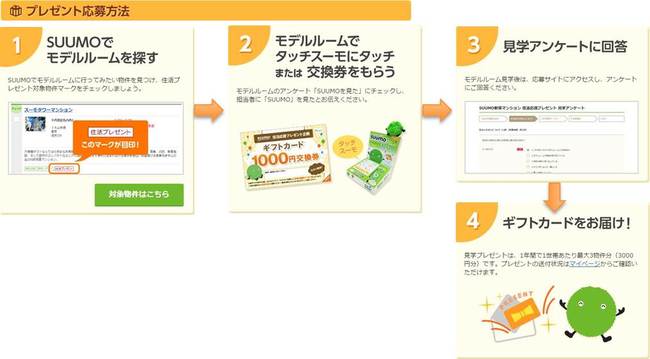 株式会社リクルート住まいカンパニー(本社:東京都千代田区、代表取締役社長:野口 孝広)は、運営する不動産・住宅サイト『SUUMO』(URL:http://suumo.jp/)にて、新築マンションを探してモデルールームをご見学された方を対象に、もれなく1,000円分のギフトカードをプレゼントする「SUUMO新築マンション 住活応援プレゼント」を、2015年1月10日(土)から実施いたします。