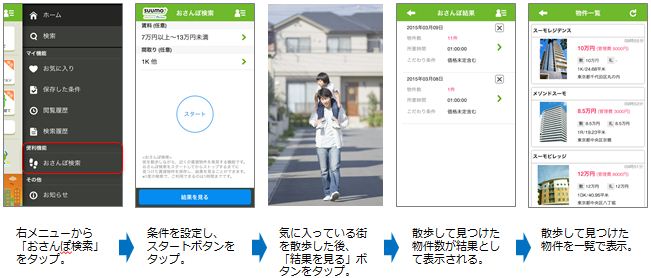 「おさんぽ検索」は、次に住む街のイメージが決まっていない時でも、ご利用していただける機能です。エリアや家賃、間取りなどといった条件を入力して物件を絞り込んでいくという従来の検索方法とは異なり、気に入った街を歩いているうちに希望の条件に合う物件がアプリ上に通知されます。本機能により、「散歩をしながら住まいと出会う」という新しい住まいの探し方が可能になります。