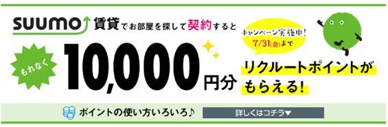 株式会社リクルート住まいカンパニー(本社:東京都千代田区、代表取締役社長:野口 孝広)は、運営する不動産・住宅サイト『SUUMO』(URL:http://suumo.jp/)でお部屋を探してご契約をされた方を対象に、もれなく10,000円分のリクルートポイントをプレゼントする「SUUMO賃貸住み替え応援キャンペーン」を2015年6月1日(月)~2015年7月31日(金)の期間実施します。