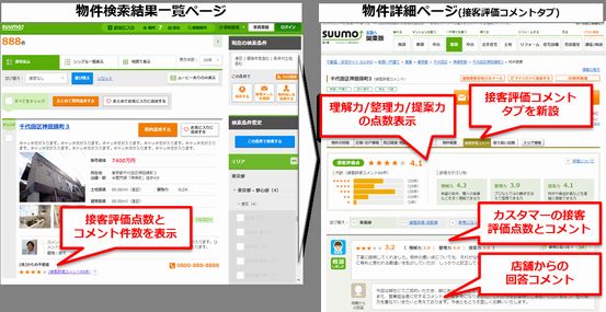 株式会社リクルート住まいカンパニー(本社:東京都千代田区 代表取締役社長 野口 孝広)が運営する不動産・住宅サイト「SUUMO」(URL: http://suumo.jp/ )では、本日8月27日(木)から、新築一戸建て・中古一戸建て・中古マンション・土地を販売・仲介する不動産会社の接客を受けたカスタマーが、その店舗の接客について点数とコメントで評価した内容を掲載いたします。