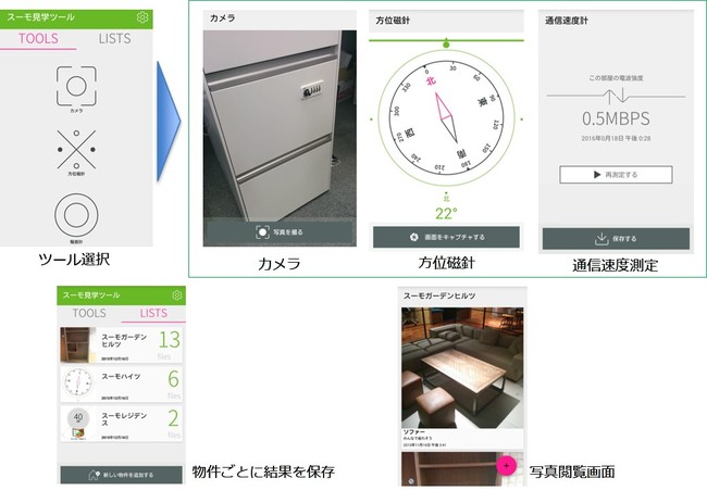 搭載する機能は、見学者が見学当日に記録し、のちに活用するためにニーズの高い「カメラ」「コンパス(方位磁針)」「騒音測定」「通信速度測定(スループット)」「テキストメモ」の5つ。これらの記録を物件ごとにアプリ上で保存し、煩雑になりがちな情報の管理や、複数物件の比較・検討をスムーズに行うことが可能となります。