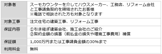 『スーモカウンター完成あんしん保証』は、スーモカウンターが保証費用を負担することで、万が一、工事中に請負会社が倒産した場合においても最大で1,000万円(または工事請負金額30%のどちらか低い方)がお客様の費用負担なく保証されるものです。