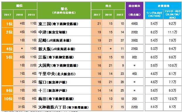 ・1位は初の「東三国」。「新大阪」へ2分、「梅田」までも8分と、交通利便性が高い。