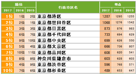 ・4位「千代田区」5位「中央区」7位「品川区」は3年連続の順位上昇。