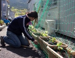 ▼12:30 大黒摩季さん テクノ仮設団地内の「緑のカーテン」視察