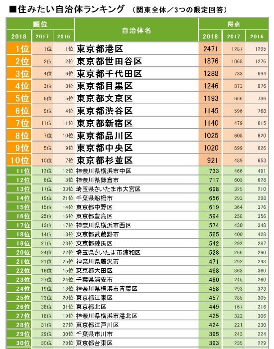 ・1位「東京都港区」2位「世田谷区」が3位以下を離して上位。3位以下は得点差が少ないがTOP10のすべてが東京23区であった。