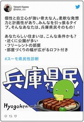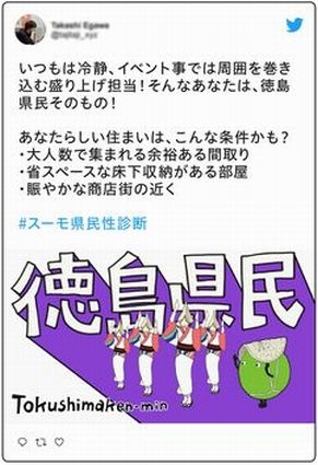 Twitterのダイレクトメール機能を用いた「#スーモ県民性診断」は、5つの質問からあなたの性格を診断し、出身地や居住地に関係なく、あなたに最も近い県民性を判定します。結果は48種類!(47都道府県+秘密の1つ)診断結果にはそれぞれ、あなたが重視するとよいかもしれない、住まい探しのヒントも掲載中です。