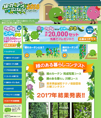 キャンペーンサイトでは、「緑のカーテン」のアサガオやゴーヤーの育て方や、エコにまつわるクイズ、スーモの壁紙やスクリーンセーバーなどオリジナルツールのプレゼントなど、豊富なコンテンツをご用意しております。さらに、7月から9月には、緑のカーテンの「完成写真」コンテストや、“緑のある暮らし“をテーマとした「川柳」のコンテストを実施予定です。