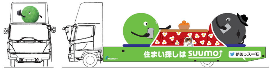 昨年9月に走行した際には、SUUMO公式キャラクター「スーモ」が街に出て住まい探しをしている様子を再現しましたが、今回は冬バージョンに衣替えし、「ドンスーモ」と一緒にこたつに入りながら住まい探しをする「スーモ」が都内を駆け回ります。見かけた際は、ハッシュタグ「#あっスーモ」をつけてSNSへの投稿をお願いします。