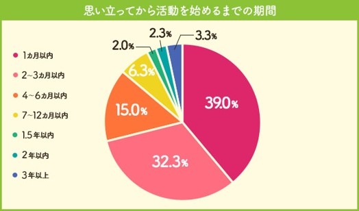 では、家づくりを思い立ってから請負契約を結ぶまで、どのぐらいの期間がかかるのだろう。調査結果によると、先輩たちは思い立ってから「3カ月以内」に71.3%が家づくりの活動をスタート。多くの人が、住宅展示場に行ったり、不動産会社に土地探しの相談に行ったりと、スピーディーに行動していることが分かる。