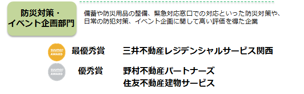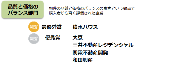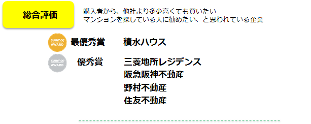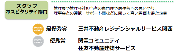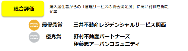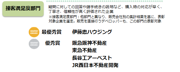 株式会社リクルート住まいカンパニー(本社:東京都港区 代表取締役社長:淺野健)は、関西の新築マンション購入者が選んだ顧客満足度を分譲マンションデベロッパーの部/分譲マンション販売・アフターの部/管理会社の部の3部門で顧客満足度ランキング「SUUMO AWARD」2019年関西版として表彰させていただくことにいたしました。各部の上位会社が決定しましたので、ご報告いたします。