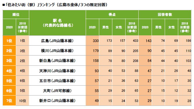株式会社リクルート住まいカンパニー(本社:東京都港区 代表取締役社長:淺野 健)は、広島県に居住している人を対象に実施したWEBアンケート形式による「SUUMO住みたい街ランキング2020 広島県版/広島市版」を集計しましたので、概要をご報告いたします。