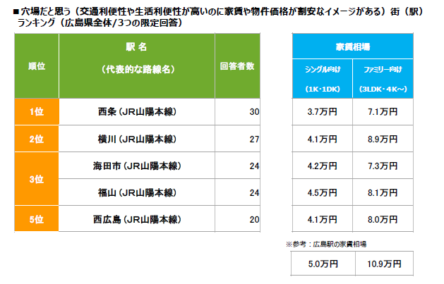 ●広島県民が選ぶ「穴場だと思う街(駅)」 1位は「西条」。開発が進み街がきれいになってきていること、学生の街として住みやすい印象。