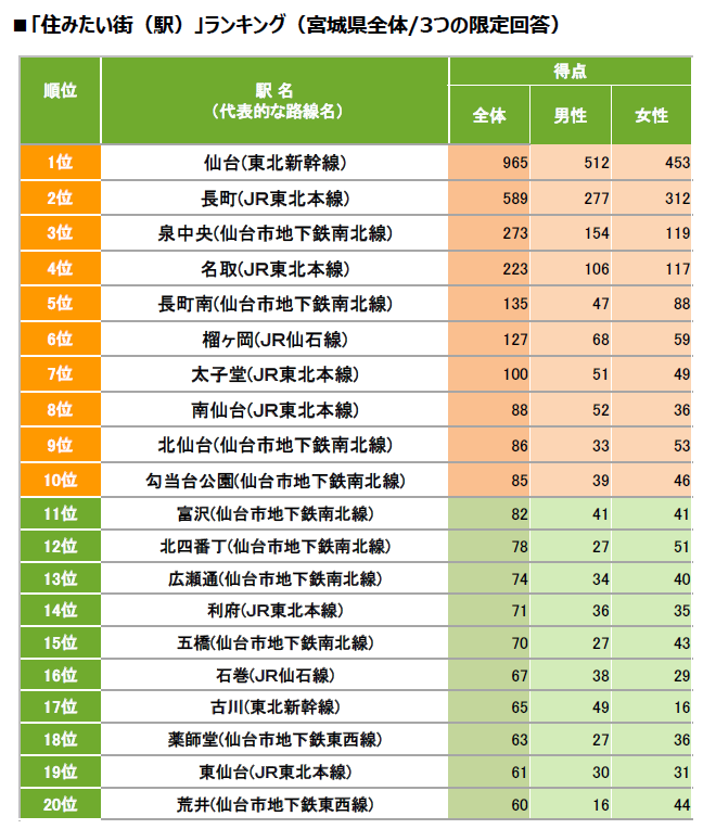 [宮城県] 住みたい街(駅)ランキング