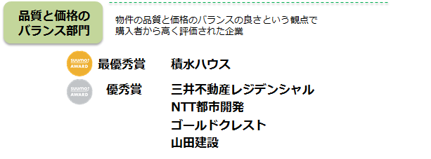 ~業界全体のサービス向上や業務改善に貢献したい~SUUMO AWARD(2020年首都圏版)は、首都圏(東京・神奈川・埼玉・千葉・茨城)で新築マンションを購入した人を対象に、マンションデベロッパー・分譲マンション販売会社や管理会社の品質や価格、取り組み内容など、さまざまな観点での満足度について尋ねたものをランキングにしたものです。調査自体は2000年から実施しており、企業ごと個別に消費者評価のフィードバックを行って参りましたが、評価の高い会社やその取り組みを公表することで、業界全体のサービス向上や業務改善につなげていただくことを目指し2018年より発表をしています。業界全体の発展とともに、消費者のより快適な住まい探しにつながればと考えております。