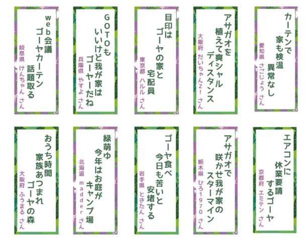 本コンテストは、「緑のある暮らし『川柳』コース」と、「緑のカーテン『完成写真』コース」の計2部門で一般募集。入賞作品の選出にあたっては、三ツ口拓也氏(NPO法人緑のカーテン応援団理事)、横澤宏一郎氏(㈱ボーダー・クリエイティブディレクター)、池本洋一(㈱リクルート住まいカンパニー・SUUMO編集長)の計3名による審査会を実施。川柳コースから10作品、完成写真コースから10作品の計20作品を選出しました。