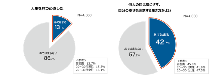 仕事や暮らしの自由度や裁量度が増したことで、改めて人生を見つめ直し、幸せを追求する人が増えてきています。緊急事態宣言前(2020年3月以前)と緊急事態宣言解除後(2020年5月以降)の変化について聞いた調査によると、「人生を見つめ直した」と回答した人が13.1%いることがわかりました。また、日ごろの考え方として42.7% の人が「他人の目は気にせず、自分の幸せを追求する生き方がよい」と回答しています。