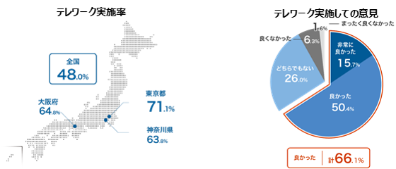 新型コロナウイルス禍の緊急事態宣言を機に、テレワークが加速。全国で48.0%、東京都では71.1%がテレワークを経験するに至りました。また、自己の判断で自由にテレワークできるようになった人の6割以上がこの変化を「良かった」と捉えています。