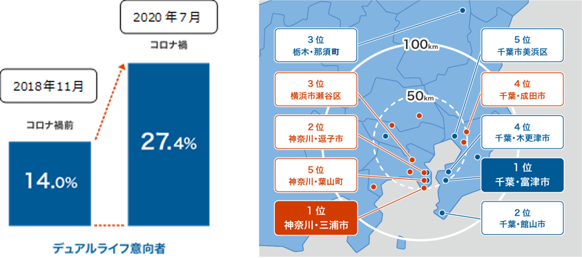 また、二拠点居住や都心以外の暮らしに対する関心も高まりをみせています。二拠点生活(デュアルライフ)意向者は2018年11月に実施した調査時より13.4ポイント増加。(図表左)『SUUMO』の物件詳細閲覧数を、2020年1月と8月で比較した際の伸び率をランキング化すると、中古マンション・中古戸建てともにTOP5のエリアが都心から100㎞圏内の郊外エリアが上位を占めました。(図表右)