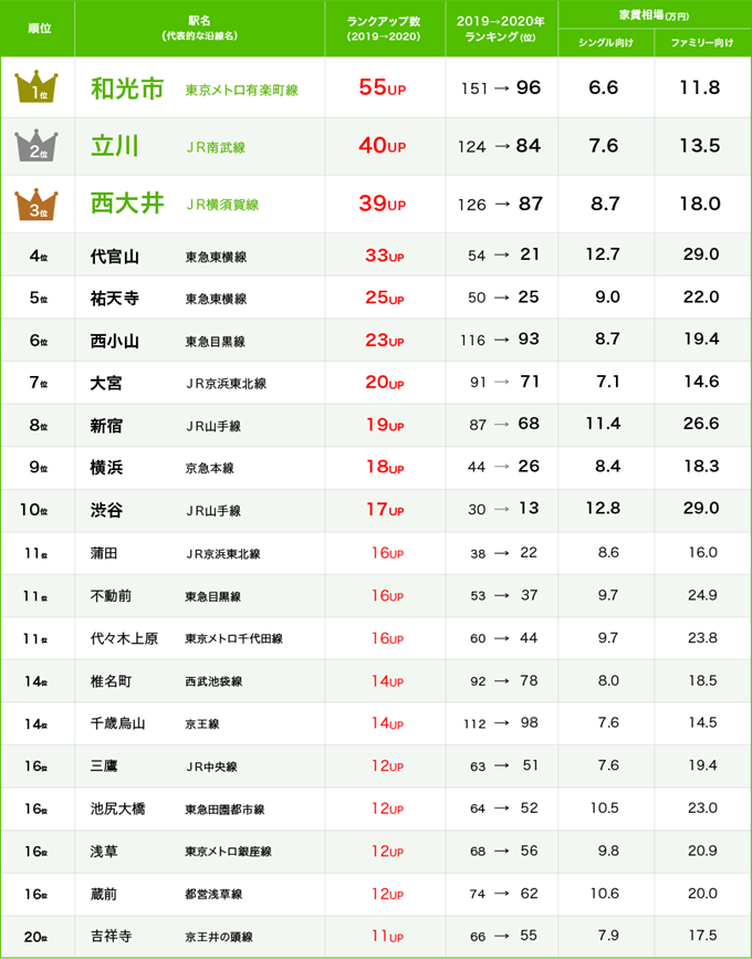 ① 「和光市」(1位)や「立川」(2位)など再開発が行われた“郊外の街”が上位にランクイン!