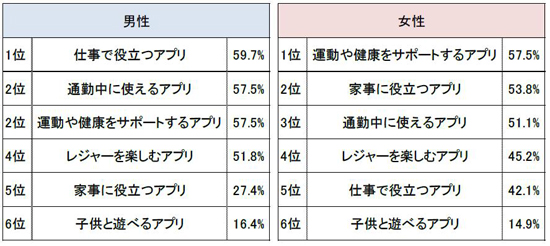 また、「ウェアラブル端末に期待したいアプリ」を聞いたところ、男性は「仕事で役立つアプリ」、「通勤中に使えるアプリ」が上位に入るなど、ビジネスシーンでの用途を期待する声が多い結果となりました。一方女性は、「運動や健康をサポートするアプリ」、「家事に役立つアプリ」が上位に入り、家庭での使用やヘルスケアに関わる用途を望む傾向が見られました。