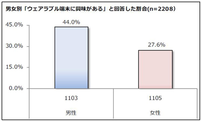 20代~40代の男女2,208名に対し、「ウェアラブル端末に興味があるか」を聞いたところ、男性は44.0%、女性は27.6%が「興味がある」と回答しました。男性が女性を16.4ポイント上回る結果となり、ウェアラブル端末への注目度に男女差があることがうかがえます。